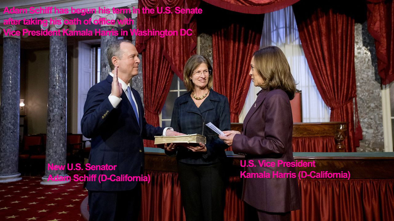 Dân biểu liên bang Luật sư Adam Schiff của Đảng Dân Chủ đến từ miền Nam California đắc cử chức Thượng Nghị Sĩ Hoa Kỳ đại diện California tại Thượng Viện Hoa Kỳ. Ông Adam Schiff (trái) chọn Phó Tổng Thống Hoa Kỳ bà Kamala Harris, và phu nhân Eve Schiff (chánh giữa) cho buổi lễ tuyên thệ nhận chức Thượng Nghị Sĩ Hoa Kỳ tại phòng nghi lễ Old Senate Chamber, ngày 9/12/2024, Điện Capitol Hoa Kỳ, Thủ Đô Hoa Thạnh Đốn. Ông vang danh kể từ thời điểm giữ chức Phó Chánh Biện Lý Hoa Kỳ tại Địa Hạt Trung Tâm California ở Los Angeles và Adam Schiff đã truy tố thành công ra Tòa Sơ Thẩm Hoa Kỳ một đặc vụ FBI Richard Miller làm gián điệp cho Liên Sô vào năm 1990.