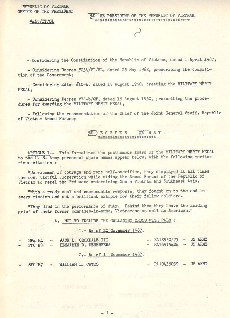 ARTICLES I.- This formalizes the posthumous award of the MILITARY