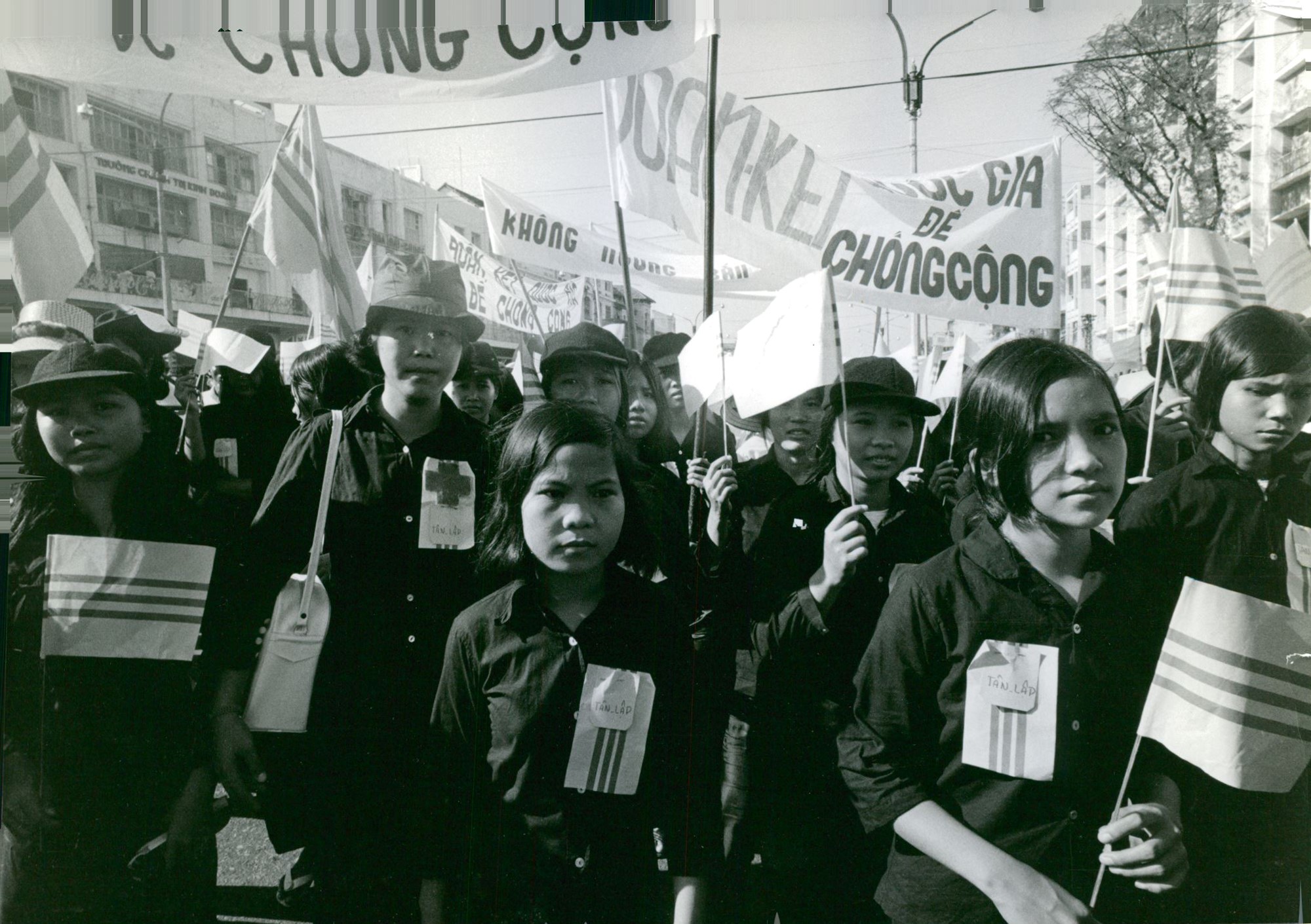 "ĐOÀN-KẾT QUỐC GIA ĐỂ CHỐNG CỘNG" - "KHÔNG NGỪNG BẮN" TRƯỚC TRƯỜNG CHÁNH TRỊ KINH DOANH/VIỆN ĐẠI HỌC ĐÀLẠT, THỊ XÃ ĐÀ LẠT, TỈNH TUYÊN ĐỨC. ĐÀ LẠT NGANG CẤP TỈNH.