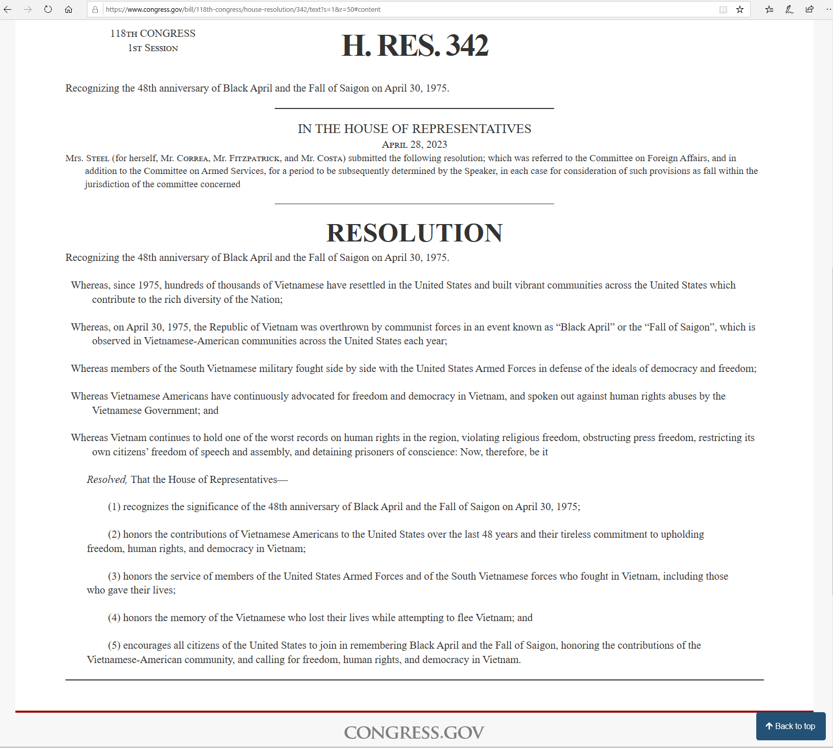 CHANHPHU.COMH.Res.342 - Recognizing the 48th anniversary of Black April and the Fall of Saigon on April 30, 1975 | Nghị Quyết H.Res.342 Công Nhận 48 Năm Tháng Tư Đen Và Sài Gòn Thất Thủ Ngày 30/04/1975 - Quốc Hội Hoa Kỳ Pháp Nhiệm 118