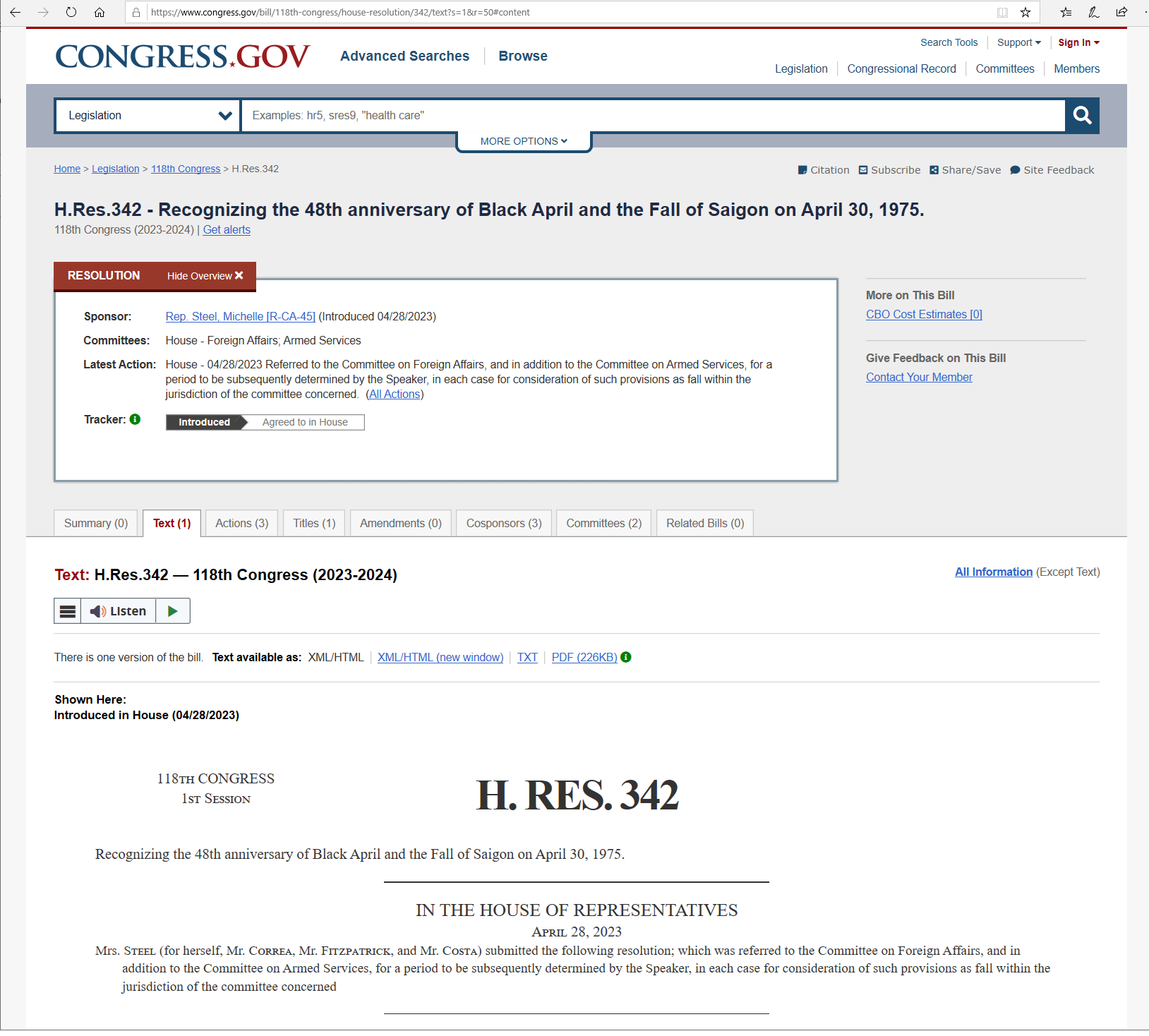 Screen shot of the website of the United States Congress, "H. RES. 342", dated 28 April 2023.